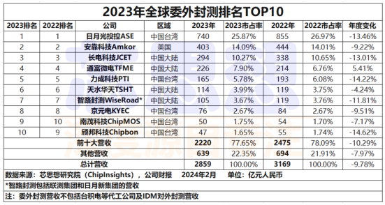 根據(jù)芯思想研究院數(shù)據(jù),2023年全球TOP10委外封測(OSAT)中,中國大陸有四家(長電科技JCET、通富微電TFMC、華天科技HUATIAN、智路封測WiseRoad),市占率為25.83%,較2022年24.92%增加0.91個百分點。其中,僅有通富微電2023年營收實現(xiàn)同比增長3.92%,歸母凈利潤均大幅下滑。2024Q1長電科技、通富微電、華天科技營收、凈利潤實現(xiàn)大幅增長,其中通富微電歸母凈利潤大幅提升2064.01%,顯示著封測行業(yè)下行周期結(jié)束、觸底反彈有望持續(xù)好轉(zhuǎn)。